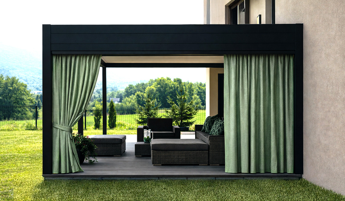 Zavese OMBRE pergoli dodajo mehkobo in občutek zasebnosti, brez da bi prostor zaprle.- Regulacija svetlobe Omogočajo zadrževanje nizkega ali bočnega sonca, ne da bi popolnoma zatemnile prostor. Svetloba ostane prijetna in razpršena.